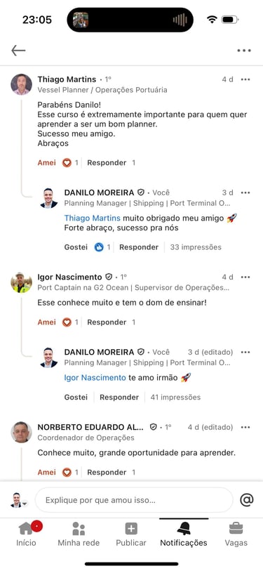 "Danilo é um profissional excepcional, cuja ampla experiência lhe proporciona uma visão abrangente e completa dos processos operacionais e de navegação. Um líder nato, possui uma habilidade extraordinária de compartilhar conhecimento de forma clara, tornando o aprendizado eficaz e agradável. Está sempre acessível, disposto a apoiar os outros e aberto à troca de ideias e conhecimentos."
